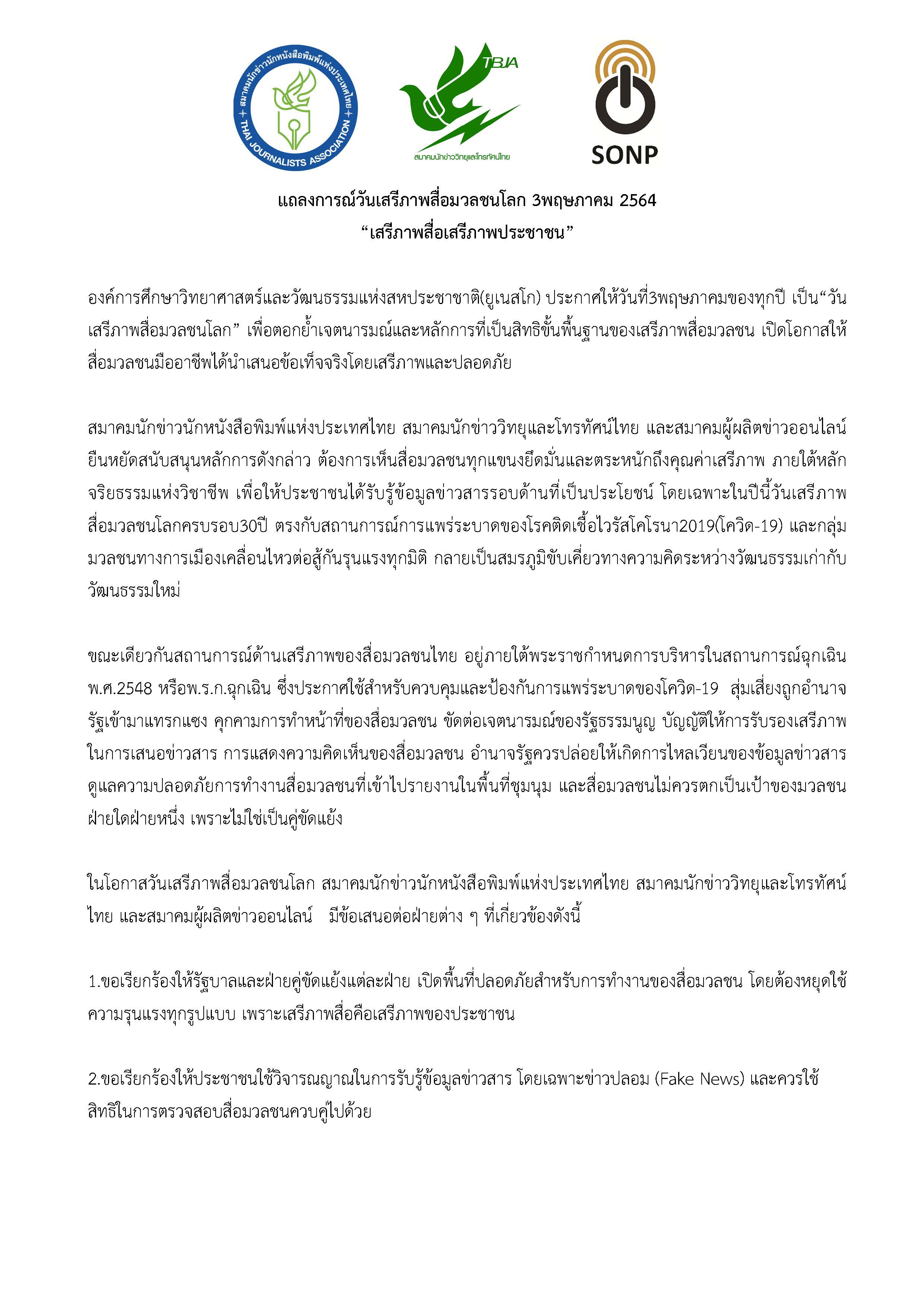 3 องค์กรวิชาชีพสื่อออกแถลงการณ์ 3 พ.ค.64 เนื่องในวันเสรีภาพสื่อมวลชนโลก (World Press Freedom Day)’