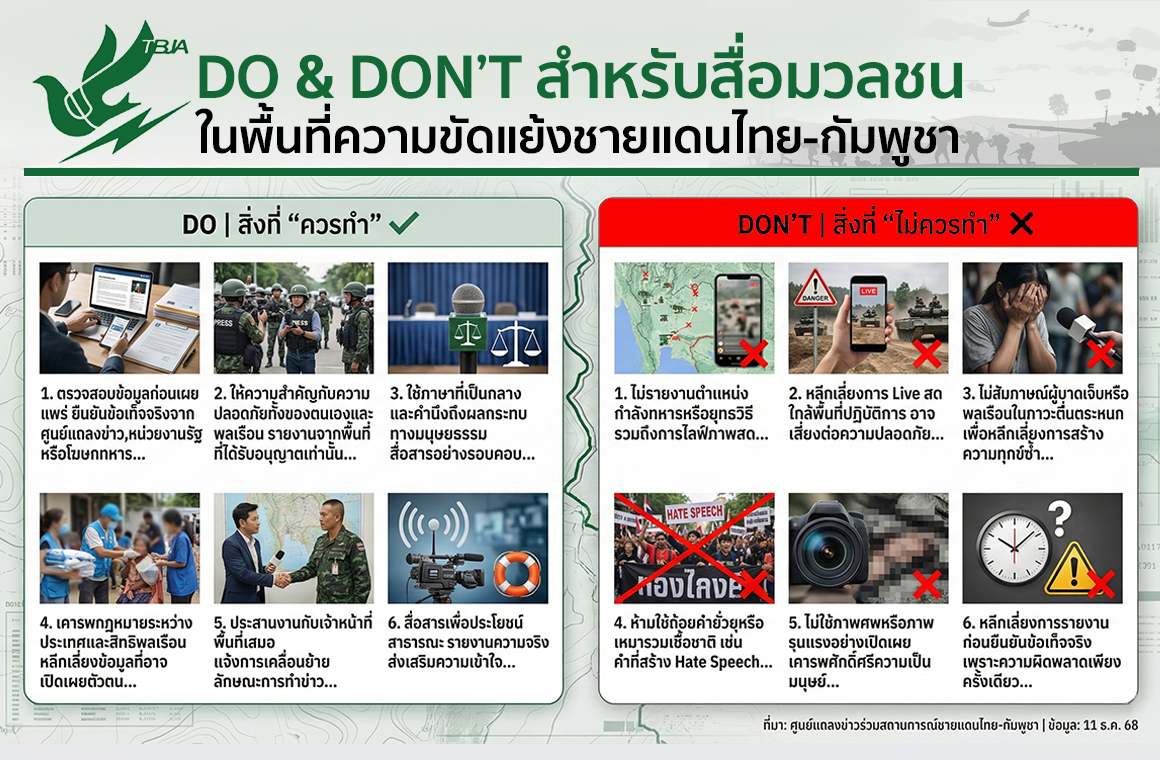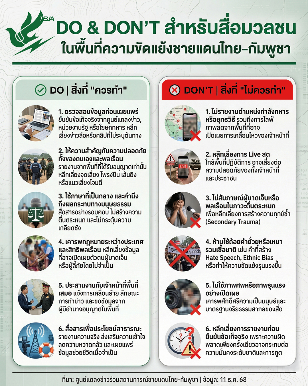 ศูนย์แถลงข่าวร่วมสถานการณ์ชายแดนไทย-กัมพูชา ออกแนวทางการปฏิบัติงานสำหรับสื่อมวลชน รายงานข่าวในพื้นที่ความขัดแย้งชายแดนไทย-กัมพูชา เพื่อสร้างการรับรู้และสนับสนุนภารกิจปกป้องอธิปไตยของกองทัพไทย ป้องกันกลุ่มผู้ไม่หวังดีบิดเบือนข้อมูล สร้างความเสียหายและกระทบต่อความปลอดภัยของประชาชนและภารกิจทหาร